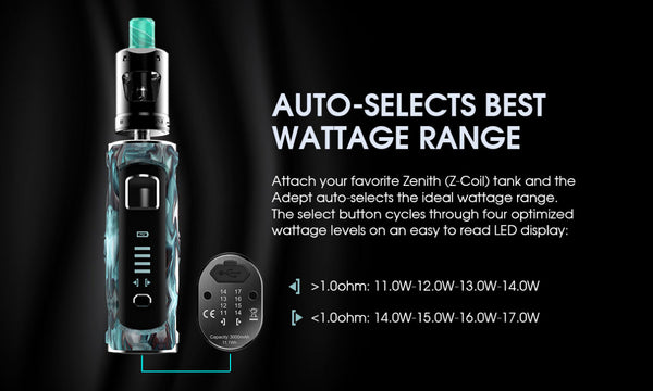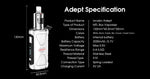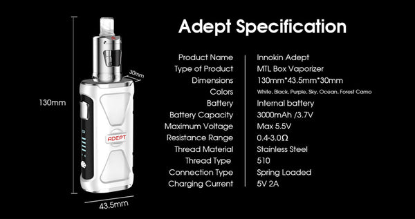 Innokin Adept Kit is a box mod style kit from Innokin featuring the Zlide tank. This kit is compatible with all Zenith coils. The Adept Kit is built to be sturdy and robust, the Adept Mod is IP67 waterproof (spray and immersion), shock proof and dust proof. The adept is paired with the popular 2ml Zlide tank giving great flavour from Innokin's Z-coil range.