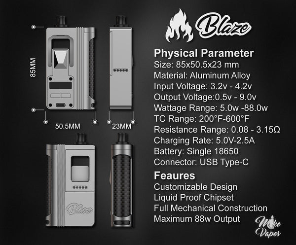 Here comes the new AIO designed by Mikevapes - Blaze AIO. The Blaze AIO is a masterpiece of engineering, crafted with fully mechanical construction and a high customizable design to fulfill the user's preferences. Equipped with a liquid-proof 88w broad-range chipset, ensuring durability and satisfaction for all-day vaping. It's compatible with all regular Boro tanks. There are 4 colors for you to choose from.