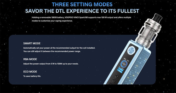 Features a crafted metallic box design and starlight panel display, VOOPOO VINCI Spark100 captures the brilliance of a starry sky in users hands. New UFORCE-X Nano Tank ensures a superior leak-proof performance and an outstanding DTL to RDL experience with its top ariflow system. Its compact size elegantly clicks with a box shape mod. The PnP X atomizing technology delivers a prolonged flavor restoration with up to 100ml without leaking or burning. Create a unique atmosphere with different starlight animations and UI themes.