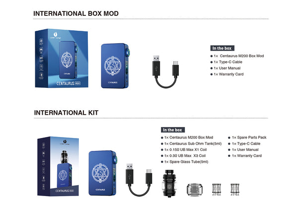 The Centaurus M200 innovates the way you look at mods . The 200W dual 18650 powered box mod with a 2A Type-c incorporates an innovative 3-in-1 jog dial control with a mechanic On / Off toggle switch is the perfect way to make vapers life easy . Featuring dual-side changeable face panel and 26mm seamless squicle aircraft-grade aluminum alloy body framing weighing just 150 + g for toughness and lightness .