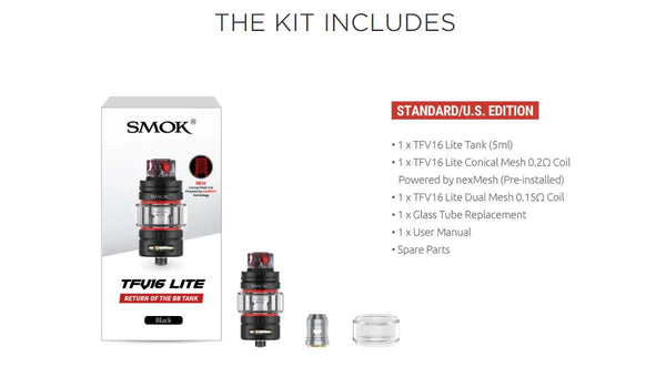Smok TFV16 Lite Tank, as its name indicates, is the lightweight version of the Smok TFV16 Tank, yet it has the same outstanding performance as the TFV16. The TFV16 Lite comes with two new mesh coils: Conical Mesh Coil and Dual Mesh Coil. The Conical Mesh Coil powered by nexMesh technology, with the unique conical structure, designed for the powerful and warm throat hit with massive vapor and amazing flavor. Let's take a look at this stunner: 5ml capacity bulb tube, an 810 resin drip tip, an upgraded airflow system, and a reliable locking mechanism, gold-plating 510 thread connecter, all of which make your ideal vaping partner.