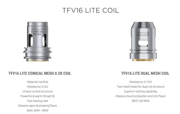 Coils: TFV16 Lite Conical Mesh Coil, 0.2ohm, Powerful & Warm Throat Hit, Best: 60-75W;